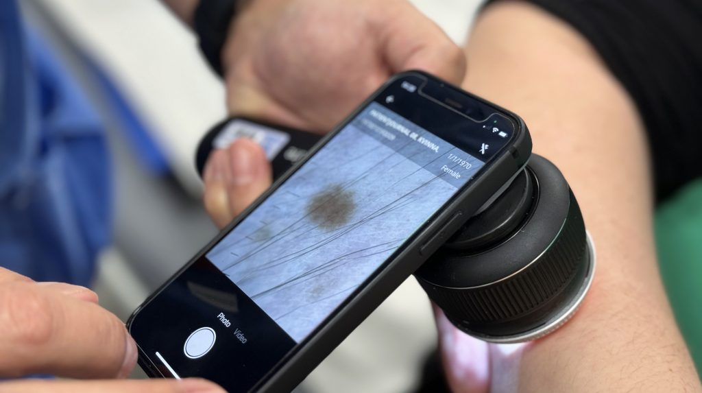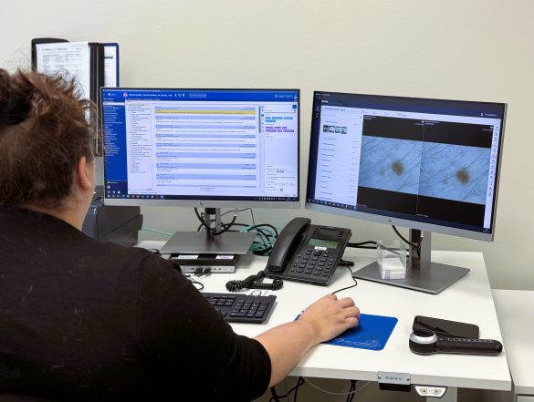 Vid vårt besök på Universitetssjukhuset i Linköping passar vi också på att hälsa på hudkliniken – en stor bildproducerande verksamhet, som utför 350–400 undersökningar i månaden med i genomsnitt 6–10 bilder på varje undersökning. Där får vi träffa Elin Johansson och Alexander Shams, som arbetar som vårdadministratör respektive specialistläkare och tumöransvarig.