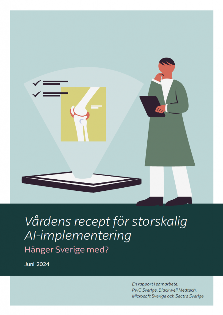 I rapporten Vårdens recept för storskalig AI-implementering – Hänger Sverige med? har vi tillsammans med PwC, Microsoft och Blackwell Medtech undersökt om och hur såväl invånare som vårdens medarbetare vill använda AI. De har uppgett inom vilka områden de anser att AI kan göra störst nytta, vilka risker de ser och vilket stöd som behövs för att medarbetarna ska bli än mer positiva till och trygga i att nyttja AI. Rapporten och dess slutsatser bygger på två enkätundersökningar, intervjuer med tio experter inom svensk vård och/eller digitalisering och AI samt dokumentstudier.