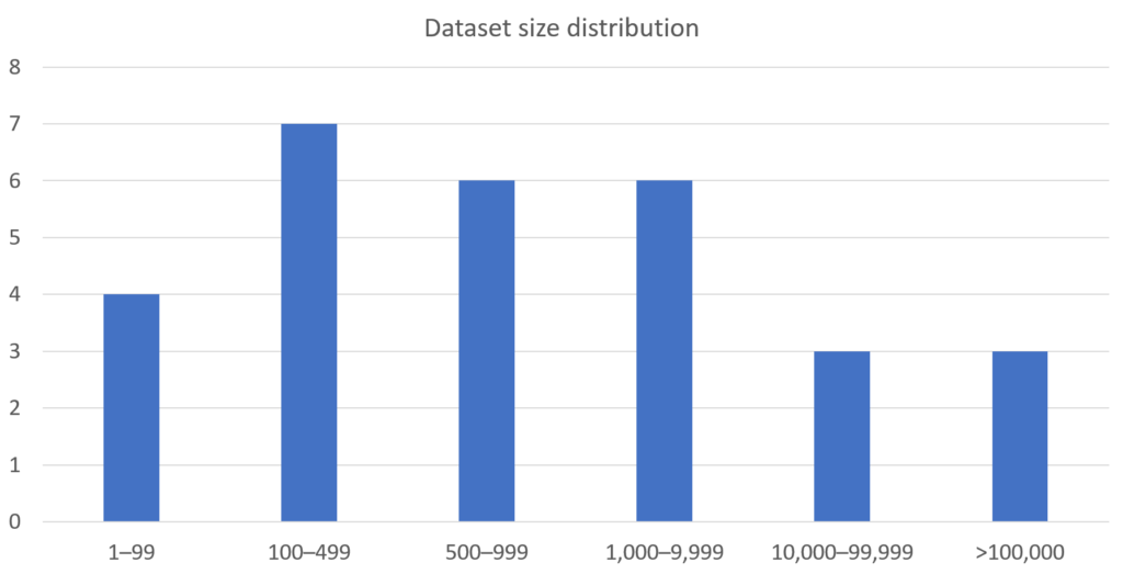 Access to relevant and sufficient data is of utmost importance when training AI algorithms. As an indication of this, four abstracts dealt with questions related to how existing data in healthcare systems can be leveraged to extract data relevant for training of AI algorithms. The following graph shows how the dataset size varied among the abstracts that trained an algorithm.