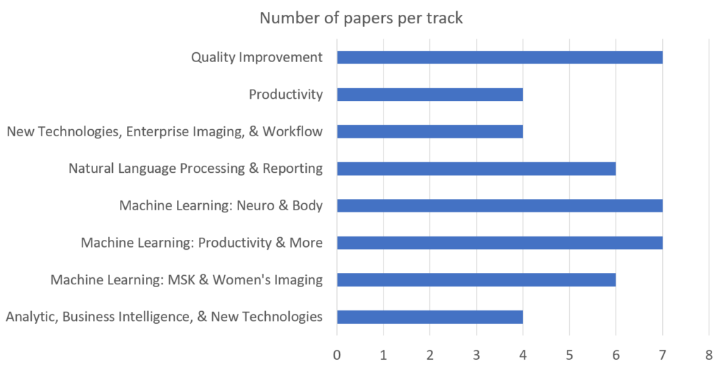 The AI trend will be a prevalent theme at the annual meeting of SIIM, as just under half (44%) of the abstracts dealt with AI—despite the fact that SIIM has a separate meeting devoted solely to AI and that several other meetings and conferences have emerged in recent years. This is further emphasized by the fact that four out of eight oral presentation tracks are dedicated to AI (ML and NLP).