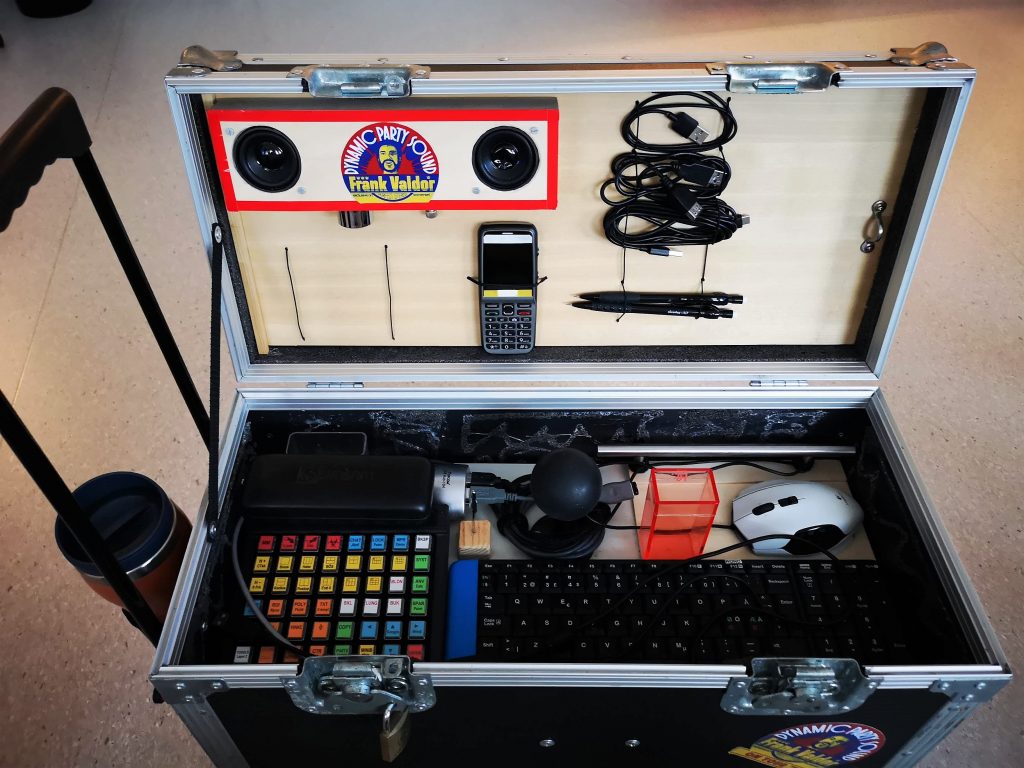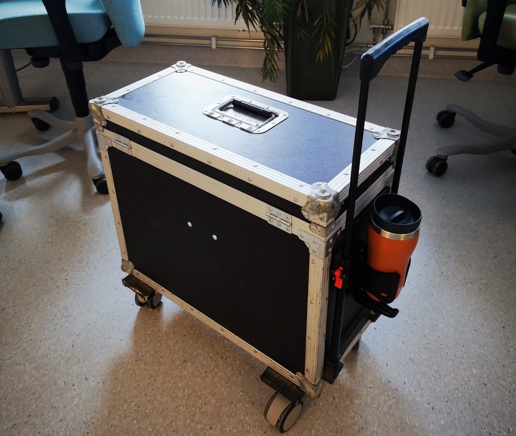 When changing workplace at the hospital in Helsingborg and when I need to bring my entire workstation, I use a hardcase box that also fits my device board. This box can also hold my arm support, a coffee cup holder, a Bluetooth speaker, and more. An additional benefit with the box is that it works as a stool for colleagues who want to sit next to me when discussing cases.