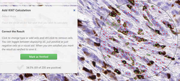 Another key aspect is to ensure that pathologists are still the ones making the decisions by giving them the ability to interact with the ML application. As I pointed out above, no algorithm is perfect, and giving the pathologist the power to change the result will create a feeling of authority and put the pathologist in the driver’s seat, instead of the opposite being the case. For this to become a reality, the visualization of the result is a crucial element in illustrating the basis for the algorithm’s decision. One example is the task of cell counting presented below, where each positive cell is market with a + sign. Pathologists can change these to a – sign if they deem these to be incorrect. The ML application should remember corrections to incentivize the pathologist to interact and refine the tool.