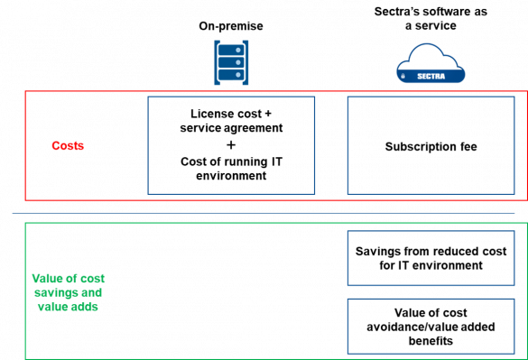 Figure 2. Illustration of the costs and added benefits of a SaaS/cloud solution vs. an on-premise solution.