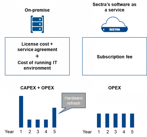 An on-premise installation usually means that the hospital must provide the hardware on which the purchased software is installed. Hence, it comes with a rolling cost for the local IT environment and a future hardware refresh that needs to be taken into consideration. The software licenses are usually paid upfront and with them comes a running service agreement fee. What the service agreement includes tends to differ significantly between vendors (see this article, in Swedish). For example, some service agreements include upgrades while other vendors require that you pay to get new functionality.