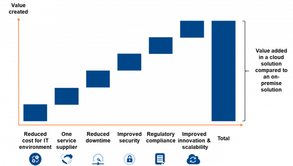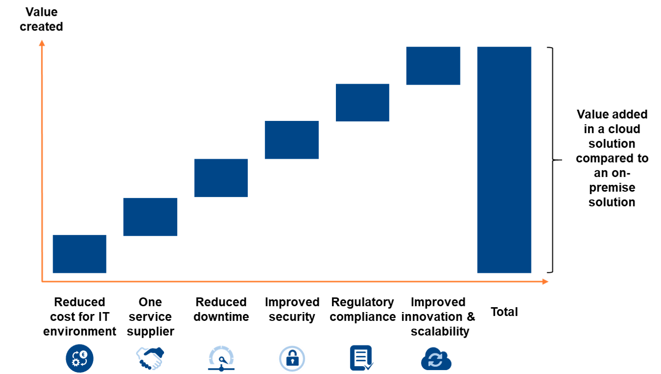 In addition, you should take into consideration the additional value a cloud-based solution can bring. The additional value should be estimated and include benefits such as higher security and uptime, fast access to new functionality, and reaction time when incidents occur.