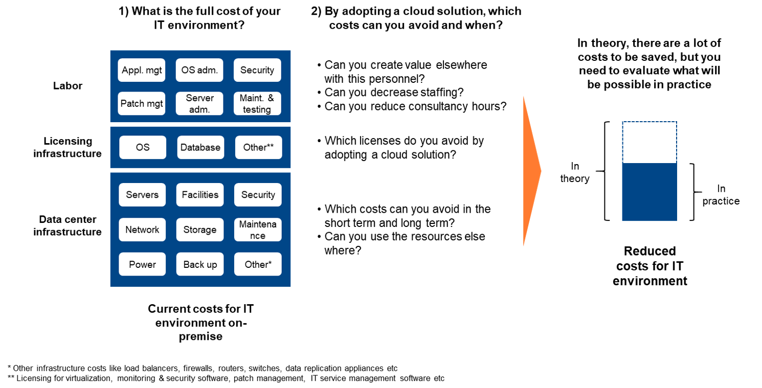 The cost savings that can be achieved for your IT environment is difficult to estimate and requires a further detailed breakdown. Figure 4 can help you understand the total cost base of your current IT environment in order to facilitate an evaluation of how much can be eliminated, in practice by adopting a cloud solution. Note that there are a lot of costs to be saved in theory, but you need to evaluate what will be possible in practice. To evaluate the true costs that can be eliminated or reduced, you should consider factors such as: