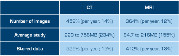 Increases in numbers of images and total data in CT and MRI exams for radiologists, 2009-2022